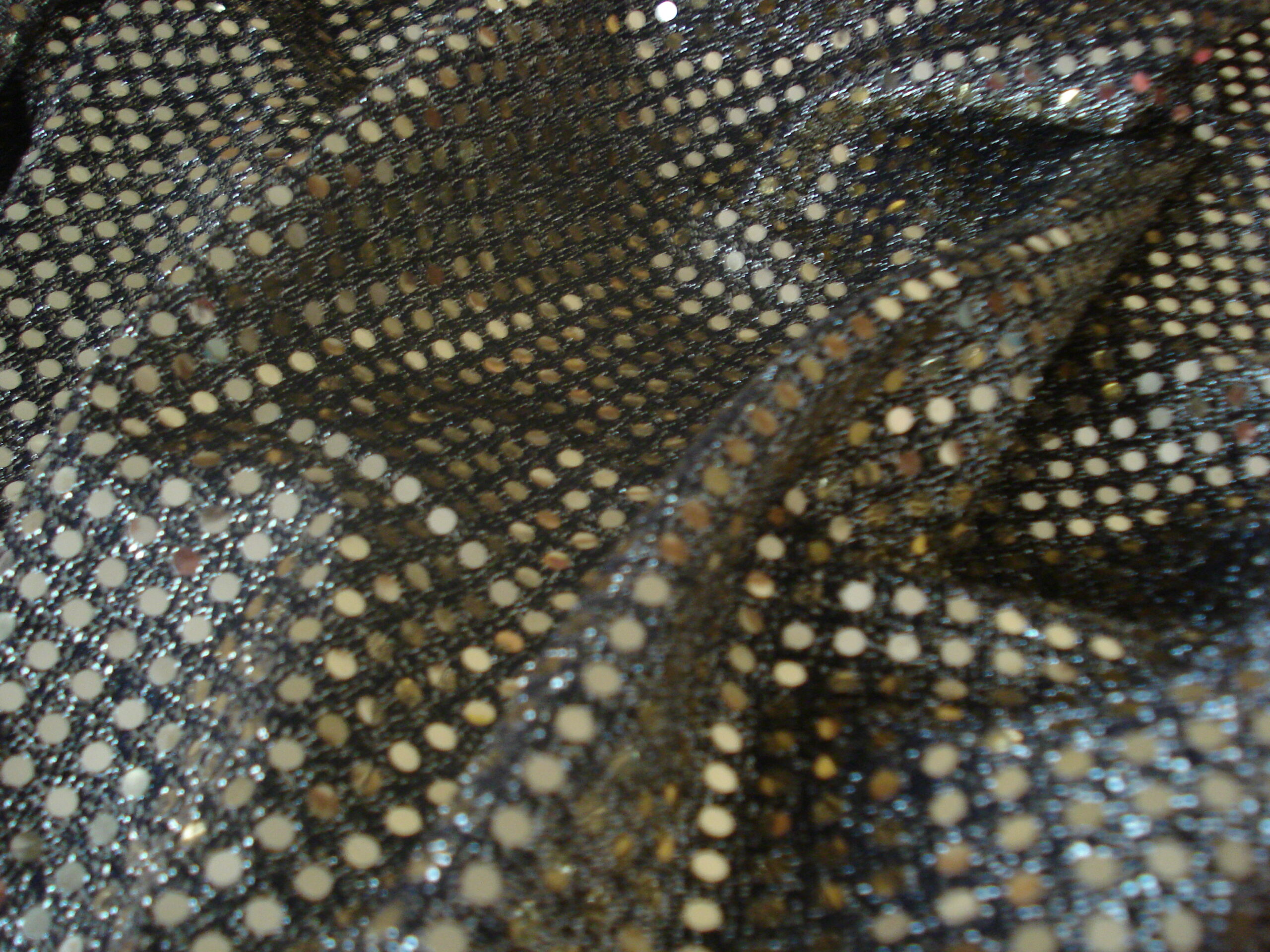 Punto elástico con hilo de lúrex y lentejuela, color dorado sobre fondo negro, ancho 1.08mts. Lavar a mano. Los colores pueden sufrir ligeras variaciones.