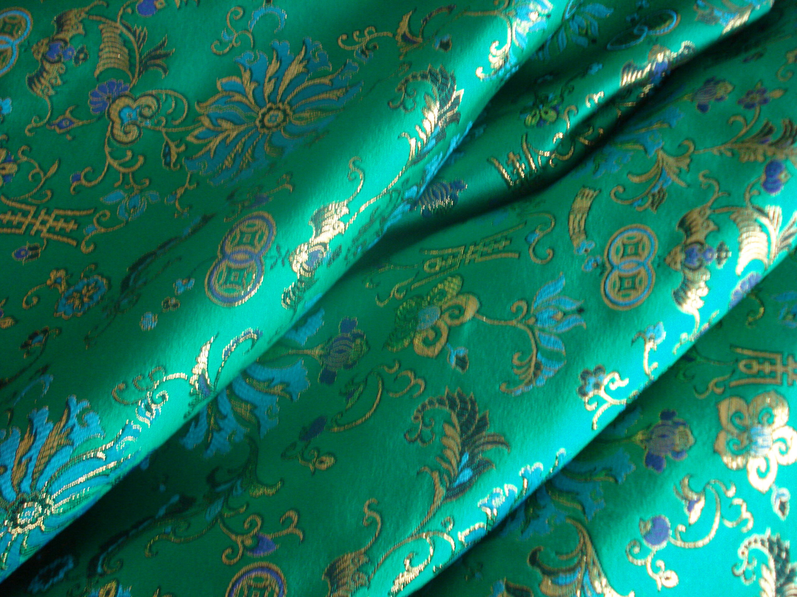 Tejido en raso fondo verde hierba con estampado oriental brillos dorados, ancho 1.14mts. Lavar a mano. Los colores pueden sufrir ligeras variaciones con respecto a la imagen.