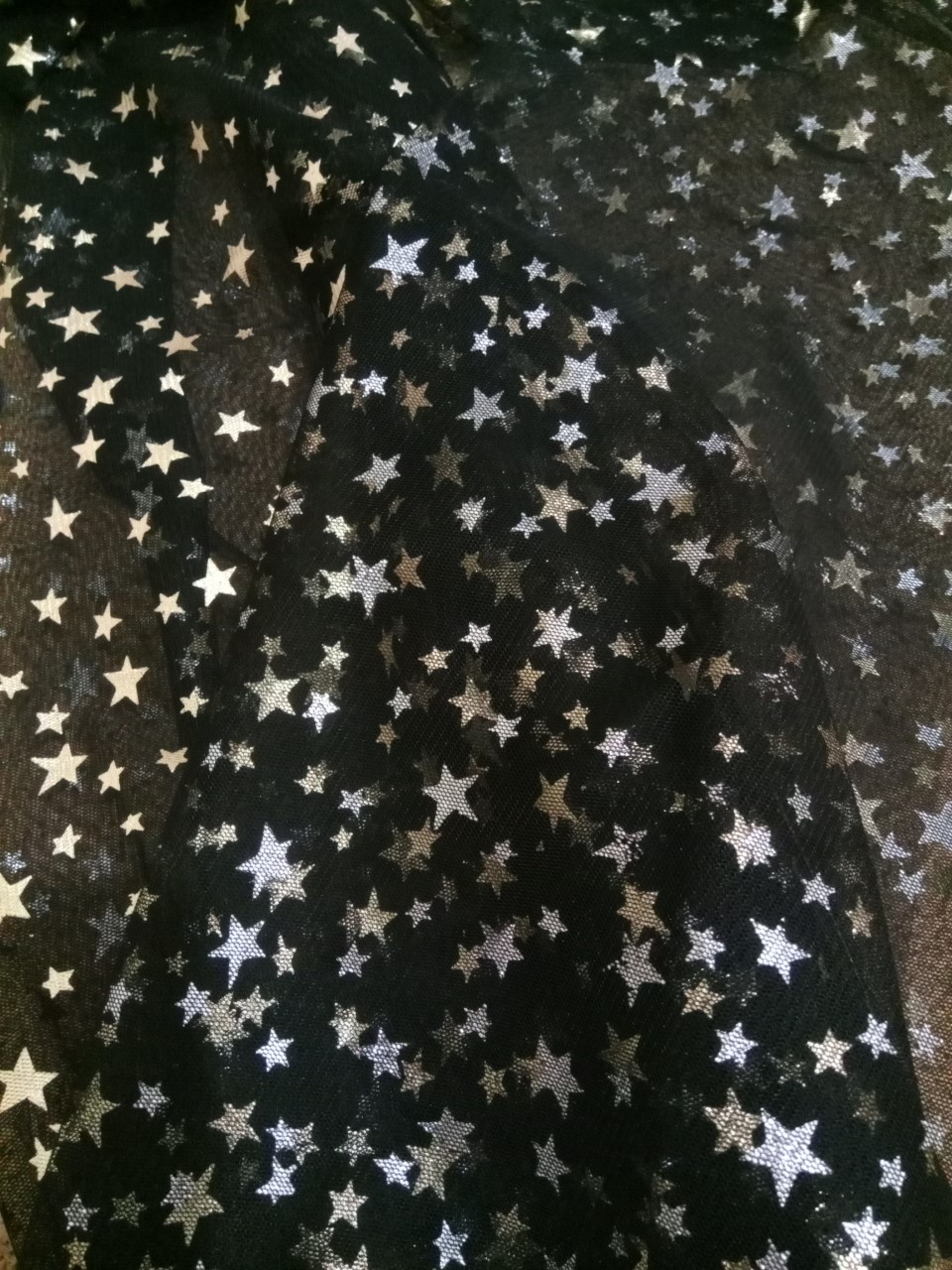 Tejido tul fino color negro con estrellas cara a (doradas) cara b (plateadas), ancho 1.50mts., lavar a mano. Los colores pueden variar ligeramente con respecto a la imagen.