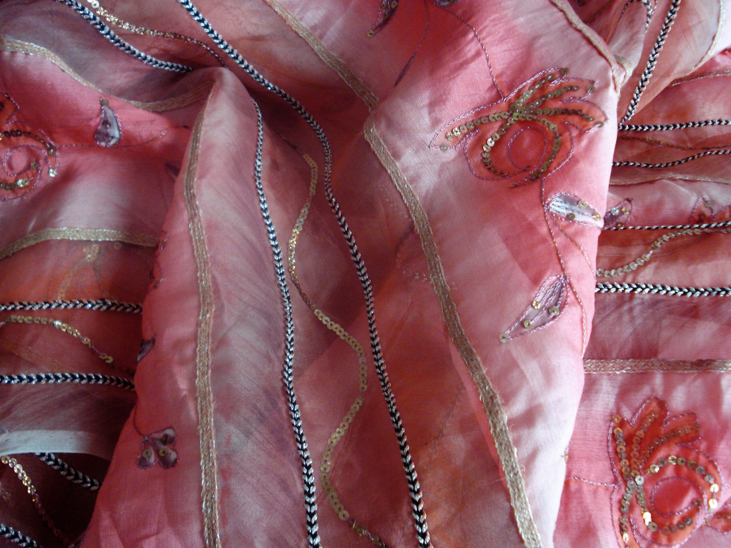 Tejido de gasa de algodón 50% y seda 50% con bordado en lentejuelas, tonos rosas, ancho 1.34mts. Lavar a mano. Los colores pueden variar ligeramente con respecto a la imagen.