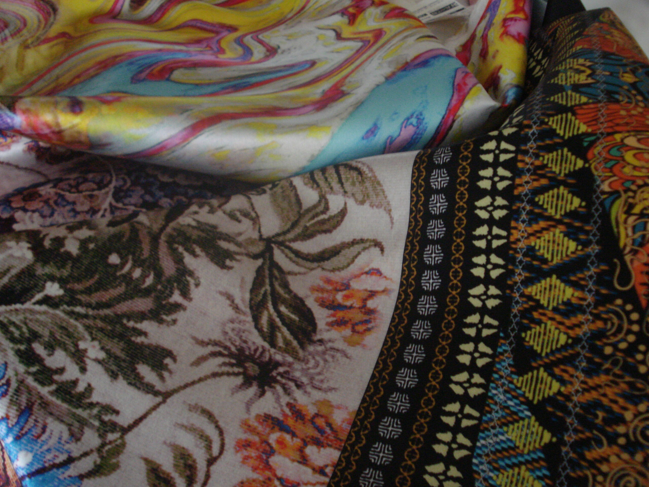 Tejido en raso con estampados estilo «barroco», ancho 1.50mts. Lavar a mano. Los colores pueden sufrir ligeras variaciones con respecto a la imagen.