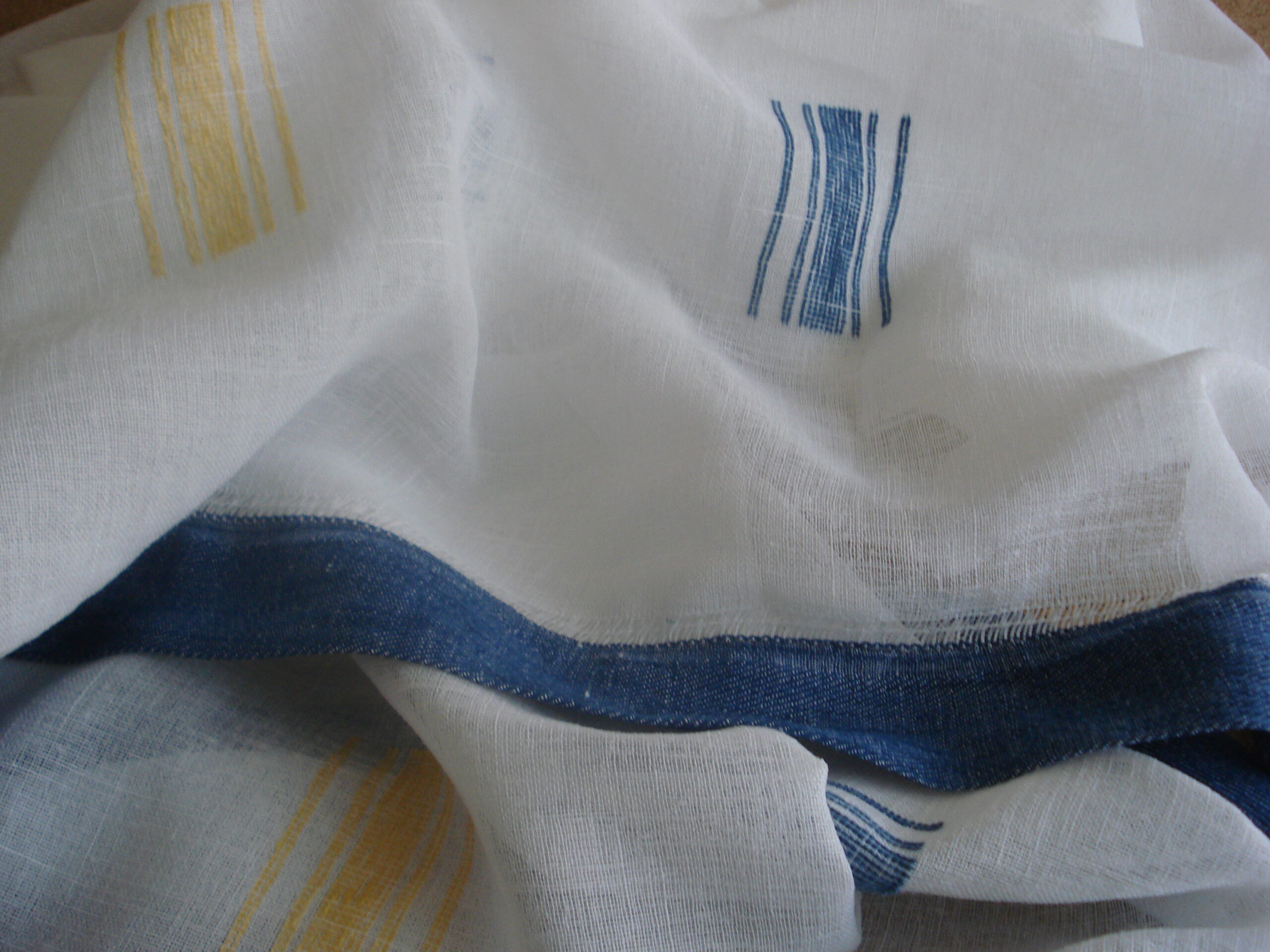 Tejido visillo imitación lino rústico f/blanco dibujos lineales amarillos/azules, ancho 2,95mts.