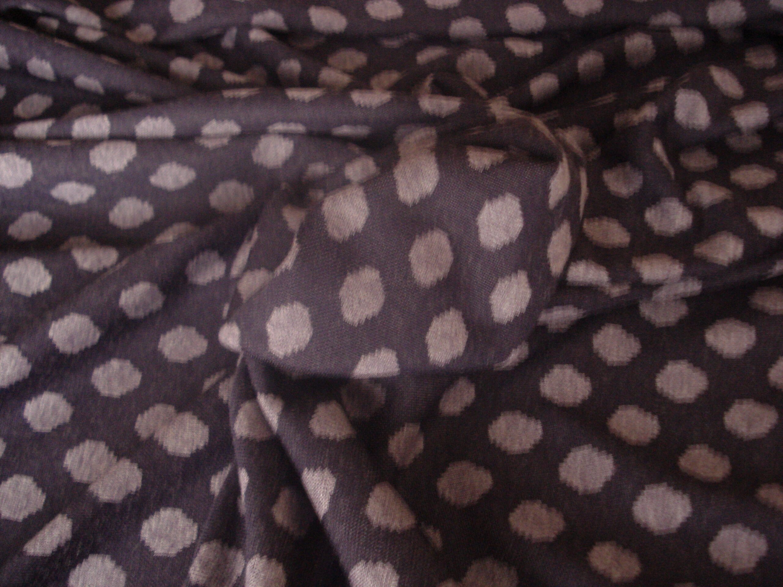 Tejido de punto color morado, con lunares color lila ancho 1.52mts. Lavar a mano, los colores pueden variar ligeramente con respecto a la imagen.