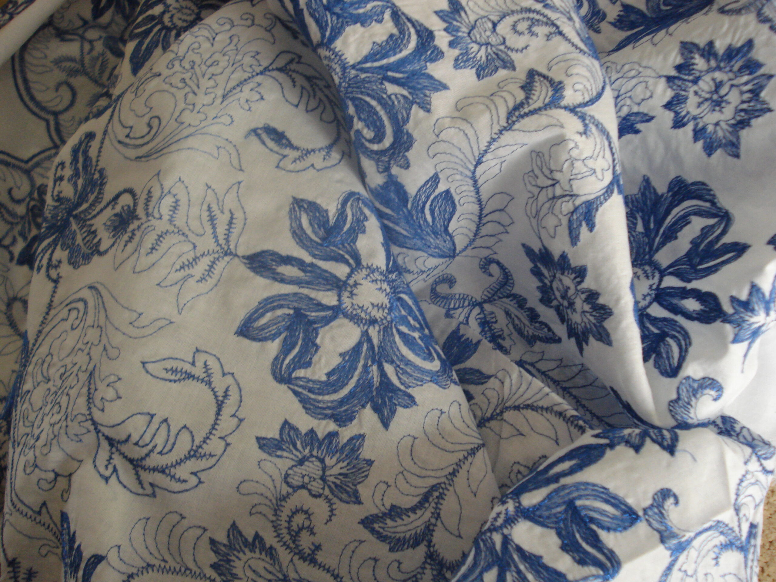 Tejido en batista de algodón bordada fondo blanco, bordado azulón, ancho 1.50mts. Lavar máximo a 30º. Los colores pueden variar ligeramente con respecto a la imagen.