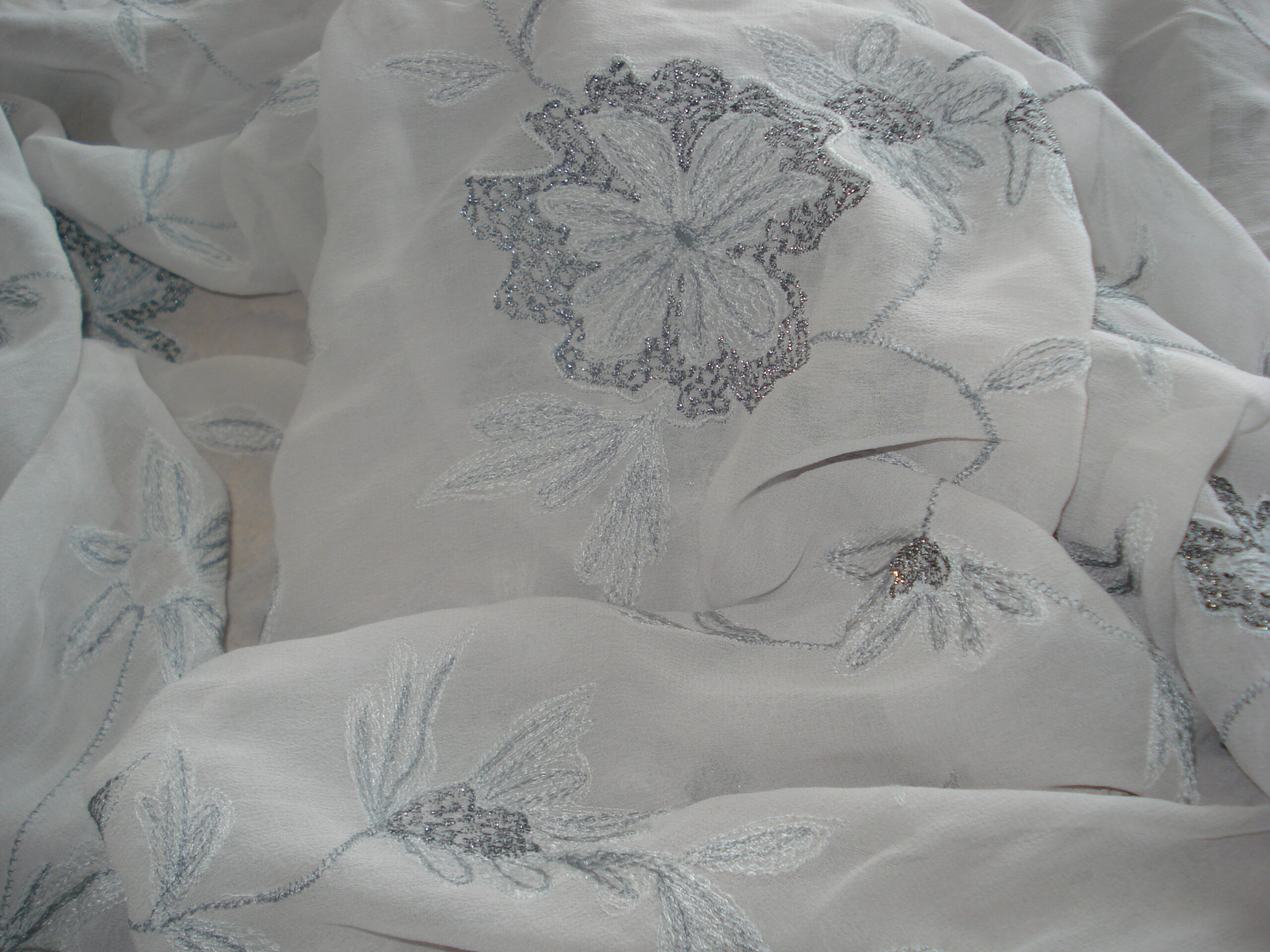 Tejido crepe georgette ligeramente granulado en fondo gris con bordado flores grises e hilo de lúrex negro, un poco elástico, 100% poliéster, ancho 1,42mts. Lavar a mano. Los colores pueden variar ligeramente con respecto a la imagen.
