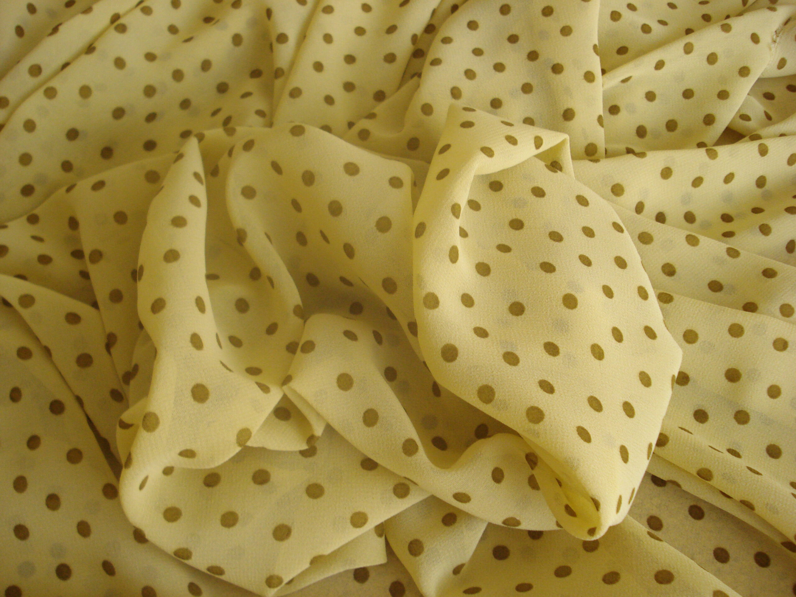 Tejido gasa fondo amarillo azufre con lunar verde oliva 100% poliéster, ancho 1,50mts. Lavar a mano, los colores pueden variar ligeramente con respecto a la imagen.